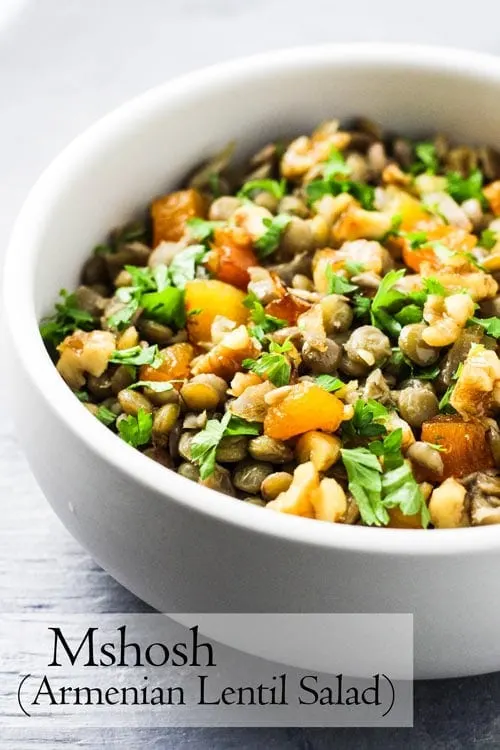 Mshosh is a simple Armenian lentil salad made with dried apricots and walnuts. This budget-friendly recipe is easy to make, flavorful and very filling.